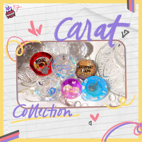 Our very first collection— Sparkling 17. Designs are inspired by our favorite seventeen songs and were created with our fellow carats in mind! These are made from resin and can function as phone grips or keyrings.